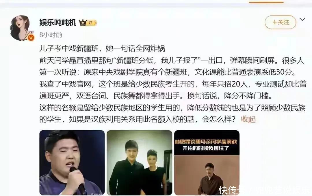 本来事情已经快要结束了,结果闫学晶儿子又被曝光进入新疆班。有网友发文称,闫学晶儿子是北京户口,却能进入新疆班,以低于普通分的成绩考入中戏。而且,新疆班的入学考试非常严格,只有少数民族才能获得资格。