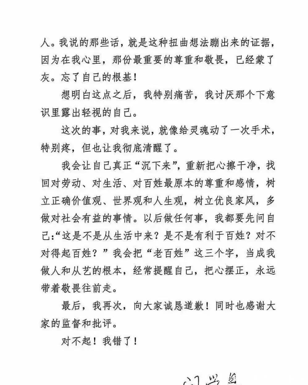 后续随后,闫学晶朋友圈发布道歉信,她讲述了事情经过,称她本人也是懵的,她从委屈到惊讶,到最后意识到自己的错误,说她忘了本。